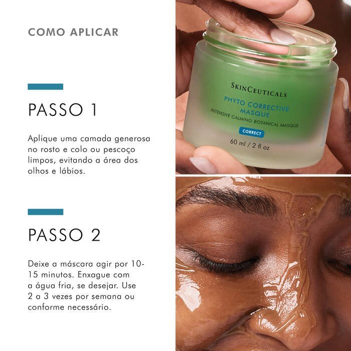 A Phyto Corrective Mask contém extratos botânicos altamente concentrados, um dipeptídeo calmante e ácido hialurônico para acalmar e repor intensamente a reatividade temporária da pele. Esta máscara facial calmante intensiva esfria ao entrar em contato, conforta a sensibilidade da pele e restaura a radiância e suavidade naturais. A Phyto Corrective Mask foi clinicamente testada após procedimentos para reduzir efetivamente a vermelhidão e o desconforto visual. Esta máscara facial botânica versátil tem usos multifacetados após a reatividade temporária da pele.
