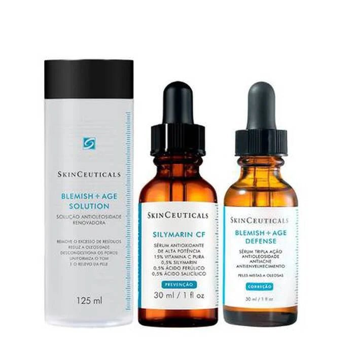 O kit proporciona Vitamina C pura que previne e corrige rugas enquanto reduz o processo inflamatório causador da acne, sérum para pele oleosa com ação tripla: antiacne, antioleosidade e anti envelhecimento precoce, além de uma solução pós-limpeza para remoção de resíduos e oleosidade na pele.